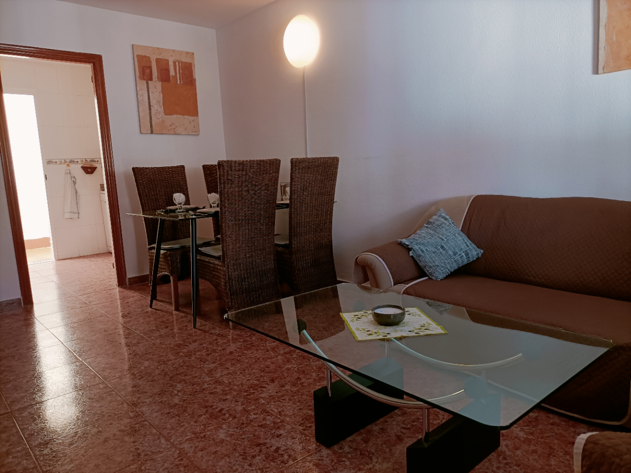 Wohnzimmer mit Essbereich, Sofa für 4 Personen und Couchtisch, Wohnzimmerschrank mit Schrankbar.