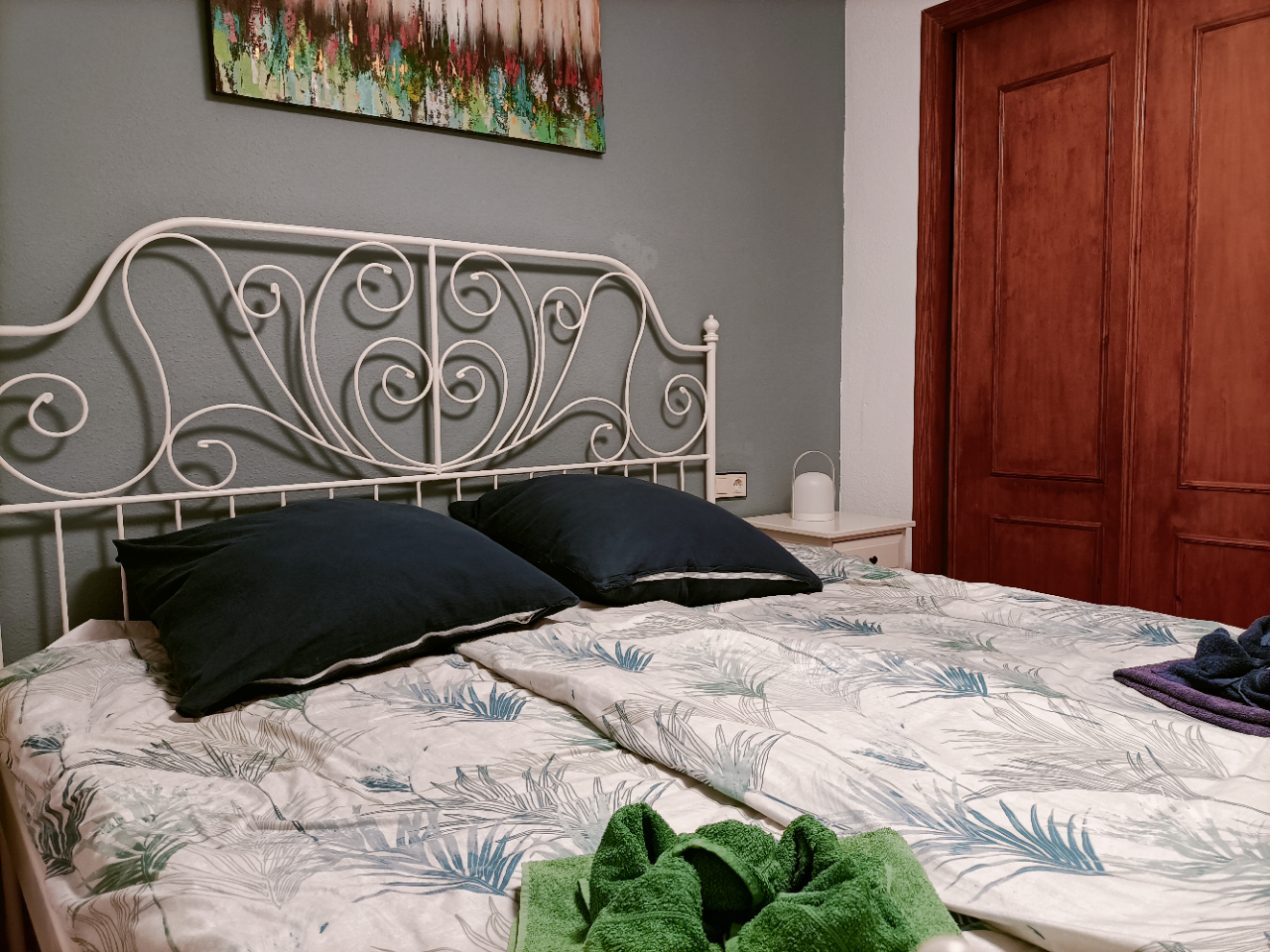 1. Schlafzimmer mit Doppelbett 2.00 m x 1.80 m, 2 Nachtschränkchen, Einbau-Kleiderschrank.