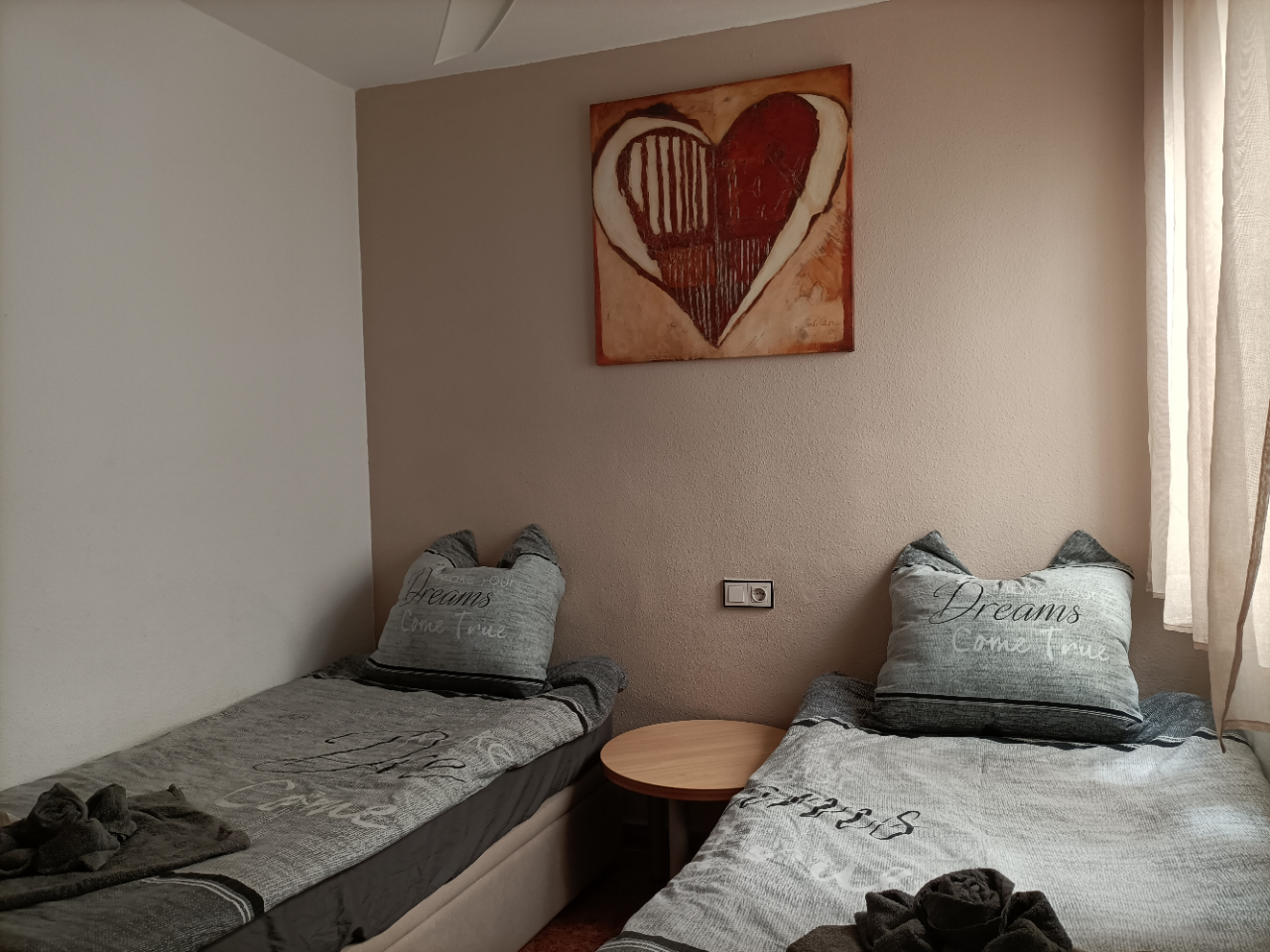 2. Schlafzimmer mit 2 Singlebetten und 1 Nachttisch, Einbau-Kleiderschrank.