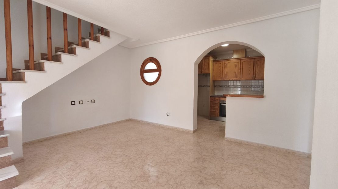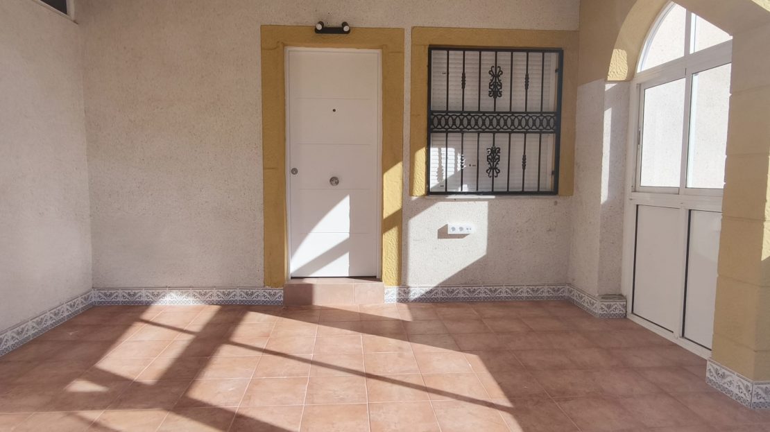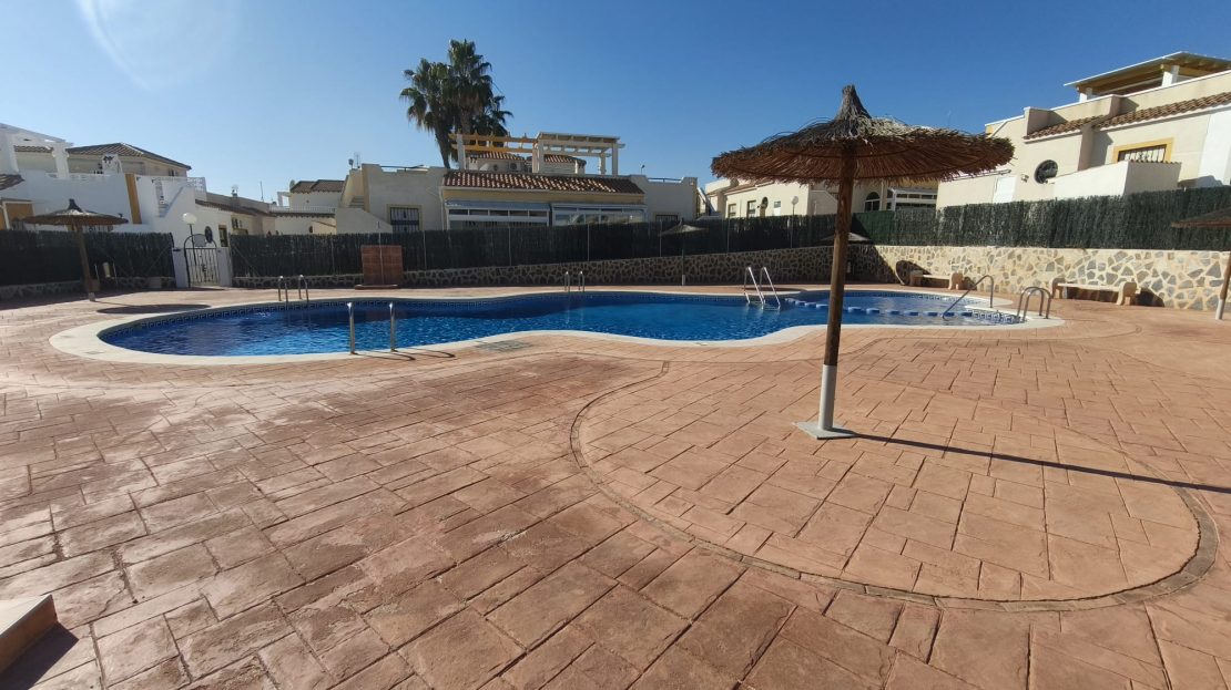 Exzellenter und sehr heller Bungalow, bezugsfertig. Das private Grundstück verfügt über zwei Zufahrten, eine für Fußgänger und eine für Fahrzeuge. Die Eingangshalle ist komplett mit Metallfenstern verglast. Im Erdgeschoss befinden sich ein Wohn-/Esszimmer, eine Küche mit Hauswirtschaftsraum, ein Badezimmer, zwei Schlafzimmer (eines davon mit Einbauschrank) und ein an das Gebäude angebauter Abstellraum mit separatem Zugang vom Grundstück. Das über eine Innentreppe erreichbare Obergeschoss bietet ein Badezimmer und ein Schlafzimmer mit Einbauschrank, das auf einen großen Balkon und eine 39 m² große Sonnenterrasse führt. Zur Anlage gehört ein Gemeinschaftspool. Der Bungalow hat eine Wohnfläche von 75,98 m² zuzüglich 39,19 m² Sonnenterrasse und einem schön angelegten Vorgarten. Die Gesamtfläche ist derzeit durch die verglaste Eingangshalle größer. Die Gegend bietet eine Vielzahl von Annehmlichkeiten wie Supermärkte, Restaurants, Bars, Freizeiteinrichtungen und ein lebendiges Flair.